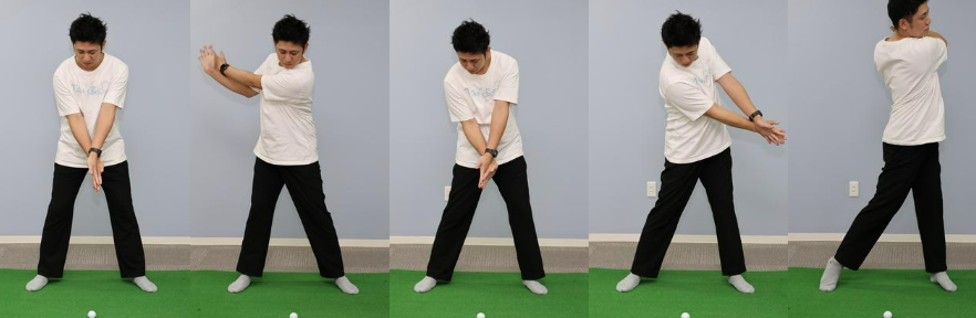 "연습장에서는 큰 몸을 사용하는 쉐도우 스윙을 추천하고, 하기 사진과 같이 손을 어깨 너비 정도로 벌리는 것이 좋습니다. 큰 공을 양손으로 잡고 손을 벌리고 멀리 공을 던지는 것처럼 온몸으로 추진력으로 쉐도 스윙을 시도하는 것을 상상해 보십시오. 몸을 많이 사용하는 것으로, 하체를 밟아 몸을 회전시키는 느낌을 재확인할 수 있습니다."