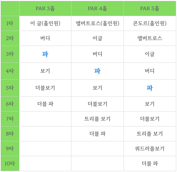 이 정도만 기본적으로 알고 계셔도 골프 타수 계산하는 데는 큰 문제가 없으며, TV로 골프를 시청하시거나 스크린 게임이나 라운딩 나가셔서 스코어 가드를 보셔도 이해하기가 쉬우실 거라 생각됩니다.