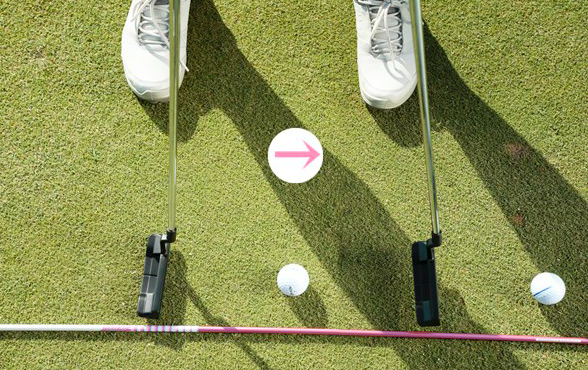 또 하나 효과적인 연습법은 토우 쪽에 스틱을 놓고 치는 드릴입니다. 토우 측에 라인을 둠으로써 헤드 궤도가 스트레이트로 움직여 똑바로 팔로우를 취하는 움직임이 몸에 붙습니다. 2가지 연습법으로 컵인 확률은 높아져요♪