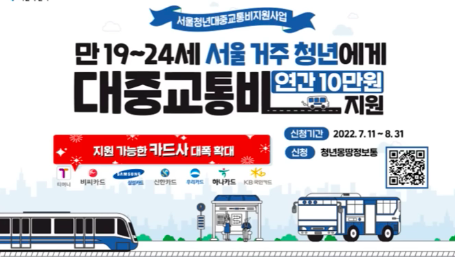 만19~24세 서울 거주 청년에게 교통비 사용금액의 20%를 년간10만원 한도 교통마일리지로 환급해 줍니다. 자세한 사항은 청년몽땅 정보통 홈페이를 통해서 확인해 보시면 됩니다.