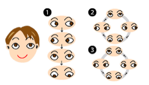 안구를 움직이는 훈련입니다. 얼굴 근육을 최대한 움직이지 않도록 의식하면서 눈알만 다음과 같이 움직입니다.
