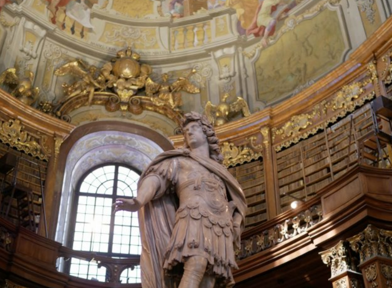 입구에서 조금만 걸어가면 도서관의 중앙 홀에 서서이 도서관 건설을 명령 한 신성 로마 제국의 찰스 6 세의 동상이 있습니다. 망토를 펄럭이며 한 지점을 응시하는 그의 모습은 용감합니다.