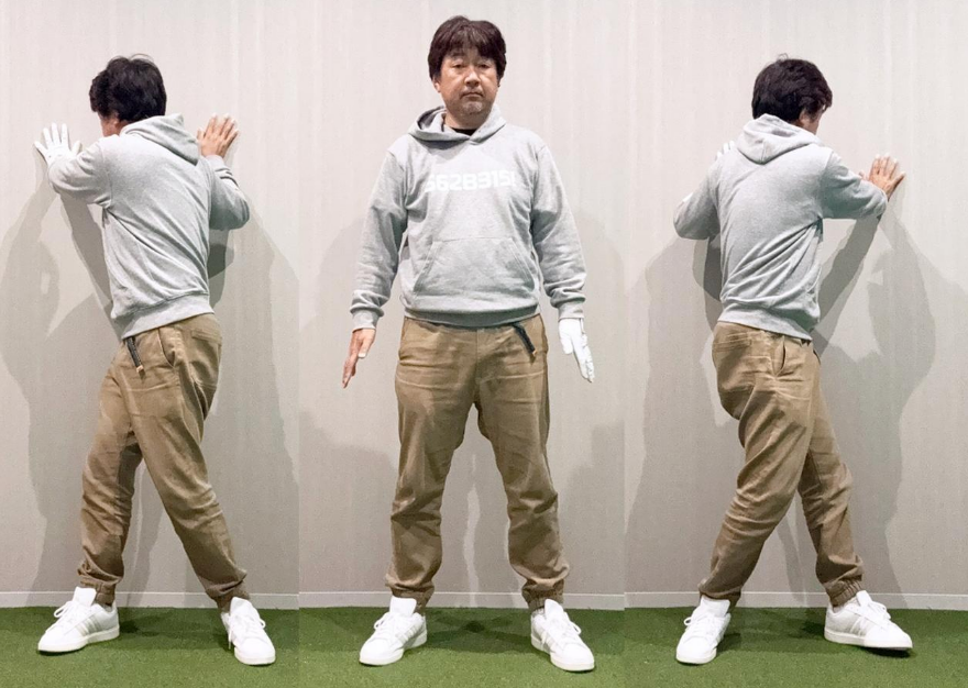 운동을 소개해드리면, 벽을 등지고 서서 몸을 돌려 벽에 손을 얹는 체조 운동입니다. 특히 50세 이상의 골퍼는 매년 몸이 뻣뻣해지기 때문에 이 운동으로 몸을 유지하는 것이 중요합니다.
