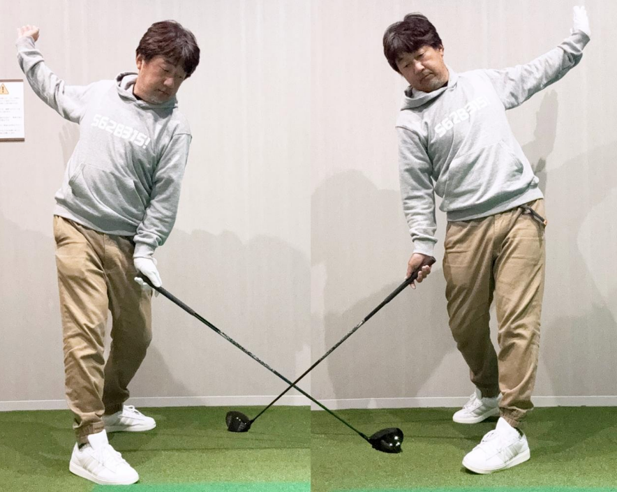 오른발 체중으로 임팩트를 만들고, 오른쪽으로 타면서 팔로우하면 큰 팔로우가 됩니다. 오른발의 무게에 의한 마무리는 멋지지 않지만, 몸이 뻣뻣한 분도 멀리 날리기 쉬워 집니다.