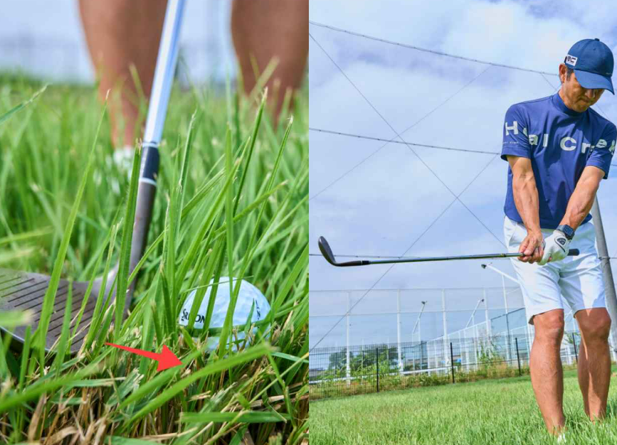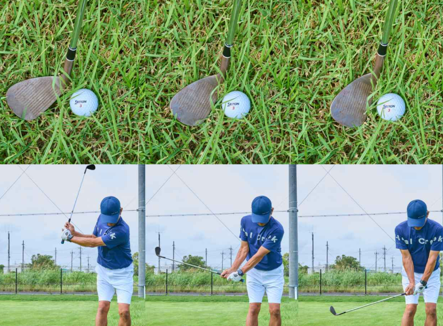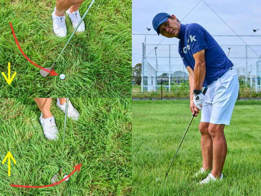 잔디가 외향이면 인사이드 아웃, 내향이면 아웃사이드 인 식으로 스윙이 되도록 궤도가 조금 바뀌도록 자세 단계부터 방향을 조정합니다.