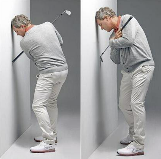 연습법은 아주 간단하다. 사진처럼 벽에 머리를 맞댄 채 선다. 왼쪽이 백스윙, 오른쪽은 다운스윙이다. 클럽을 품에 안듯이 가로로 잡고 스윙 동작을 한다. 이때 머리가 좌우로 밀리거나 벽에서 떨어지지 않아야 한다. 머리의 움직임은 전후좌우 4가지 방향이다. 머리가 벽을 밀거나 벽과의 사이가 멀어지면 이번에는 앞뒤로 움직이고 있다는 증거다.