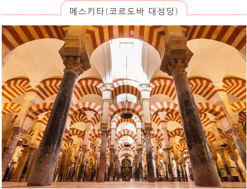 "메스키타"는 스페인어로 이슬람 예배 장소인 모스크를 의미합니다. 코르도바의 메스키타 (Mezquita of Córdoba)는 모스크 안에 기독교 성당이있는 특이한 건물입니다. 흰색과 빨간색의 이중 아치형 객실은 메스키타의 상징입니다. 티켓은 온라인으로도 예약할 수 있으며, 월요일부터 토요일까지 08:30부터 09:30까지 무료로 운영됩니다.