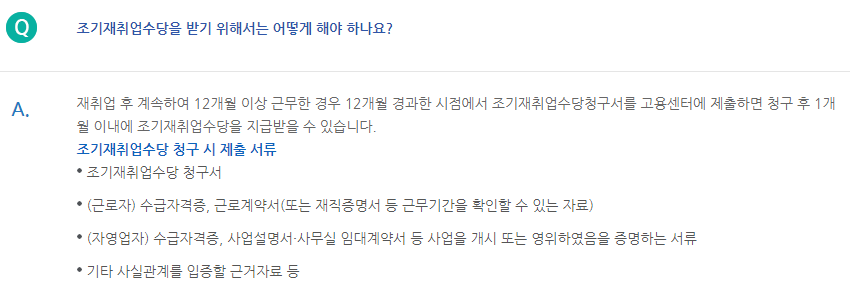 - 재취업한 날 또는 사업을 시작한 날부터 12개월이 경과한 이후 관할 고용센터에 조기재취업수당 청구서 및 관련 증빙서류 제출(사후지급)