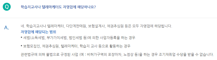 - 자영업으로 조기재취업수당을 받기 위해서는 자영업활동계획서를 제출하고 자영업활동으로 실업인정을 1회 이상 받아야 합니다.