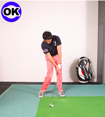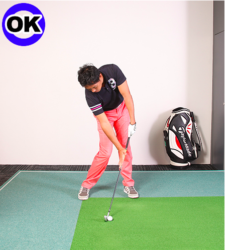 아이언은, 조금만 핸드 퍼스트(손잡이측이 헤드보다 목표 방향으로 기울어져 있는 상태)에 맞히면, 가장 안정됩니다. 어드레스로 공을 스탠스의 중앙 부근에 두고 손을 왼쪽 허벅지 부근에 세팅하면 약간 핸드 퍼스트 자세가 되며, 임팩트에서도 이때 샤프트의 기울기를 재현하는 것이 이상적입니다.