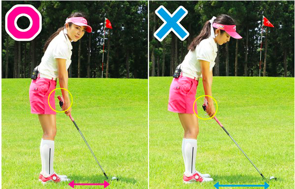 어드레서에서 주의사항은 볼과의 거리감입니다. 공과의 거리가 멀면 실수의 확률이 높아지므로 퍼팅 때와 같은 정도의 거리에서 공에 접근합니다. 나머지는 손목을 고정하고, 몸의 회전으로 흔들어 봅시다♪
