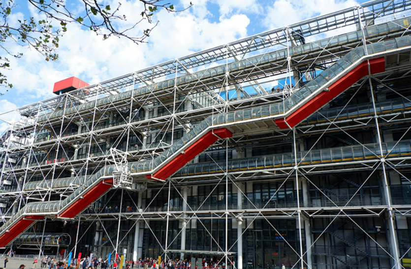 퐁피두 센터는 파리에서 가장 오래된 지구 중 하나에 위치한 거대한 박물관입니다. 실내 공간을 최대한 활용하기 위해 모든 파이프와 엘리베이터는 색상으로 구분되어 실외에 설치됩니다.