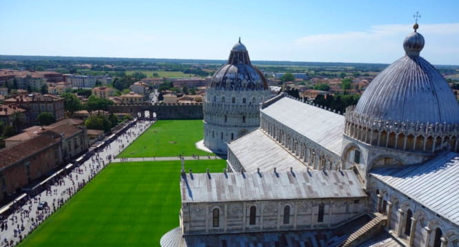 사탑 위에서는 피사의 두오모 광장과 시가지가 한눈에 들어옵니다. 두오모(대성당)와 세례당도 잘 보이고 푸른 잔디가 너무 예쁘죠?^^