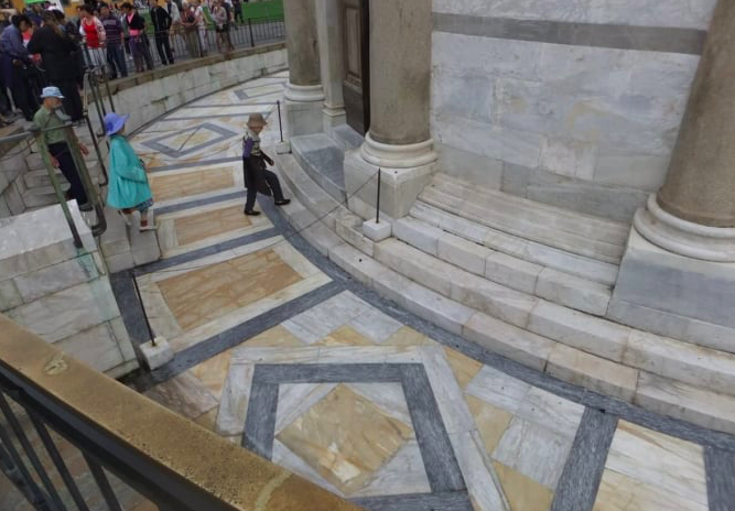 하얀 대리석과 장식이 아름다운 원통형 건물은 200여 년에 걸쳐 만들어졌다는 세례당입니다. 1층은 열기둥과 아치, 2, 3층은 첨탑군과 삼각형, 20개의 창으로 장식되어 있습니다.