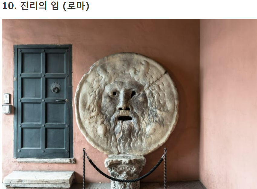진실의 입은 이탈리아 로마의 관광 명소가 되었는데, 그레고리 펙이 연기한 신문 기자 조는 오드리 헵번 주연의 영화 "로마의 휴일"에서 오드리 헵번 주연의 영화 "로마의 휴일"에서 장난을 쳤는데, 오드리 헵번은 손을 넣으면 거짓말쟁이가 손을 자르고 그녀를 물었다는 전설을 가지고 있습니다.