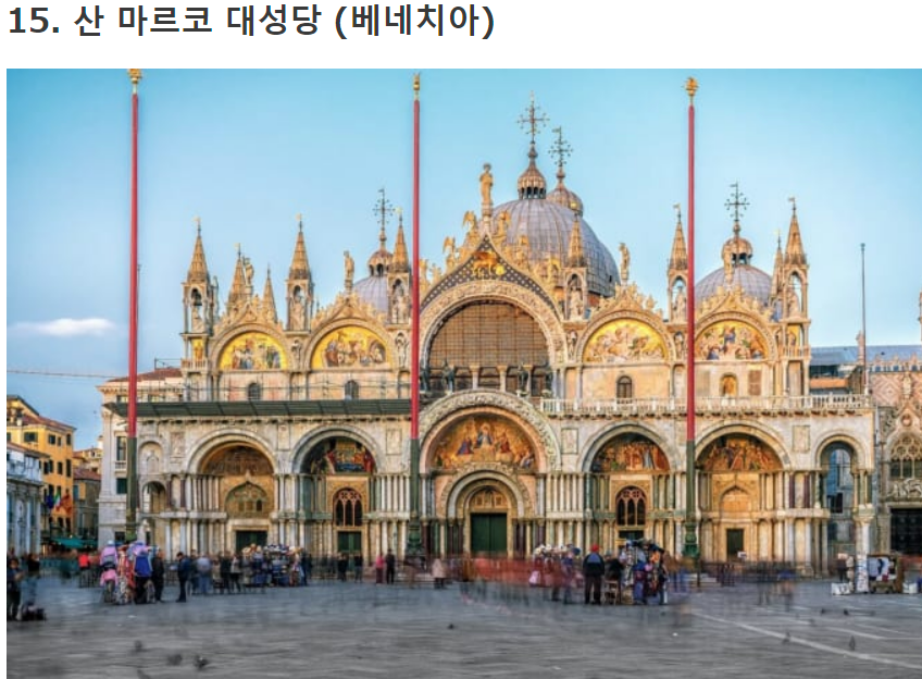 두 명의 베네치아 상인이 운반한 산 마르코의 시신을 모시기 위해 지어졌다고 전해지는 산 마르코 대성당은 이탈리아 베네치아에서 가장 유명한 사원 중 하나입니다. 500 년 이상 전에 콘스탄티노플에서 유행했던 양식을 채택했다고 전해져, 동유럽 제국의 영향을받은 비잔틴 건축을 대표하는 기념비적 인 건물이며, 탑 끝의 독특한 둥근 모양이 매우 인상적입니다.