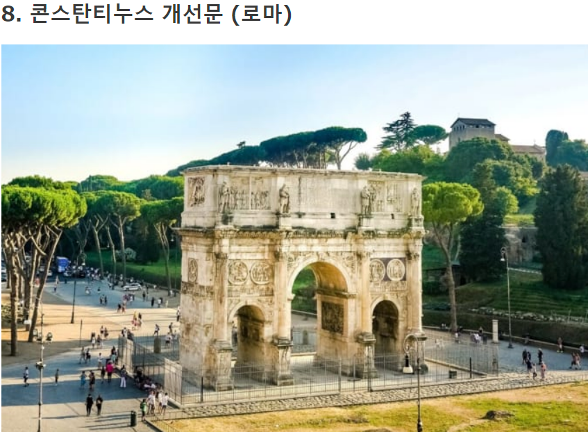 콘스탄티누스 개선문은 로마 제국의 47대 황제인 콘스탄티누스 1세의 통치 기간 동안 일어난 전쟁의 승리를 기념하는 기념물입니다. 그것은 312 년에 일어난 내전 "밀 비안 다리 전투"에서 테트라르키아 황제 막센티우스에 대한 승리 후에 지어졌습니다. 전쟁의 희생양이 된 병사들의 고통과 승리의 기쁨 등 다양한 생각을 불러 일으키는 개선문입니다.