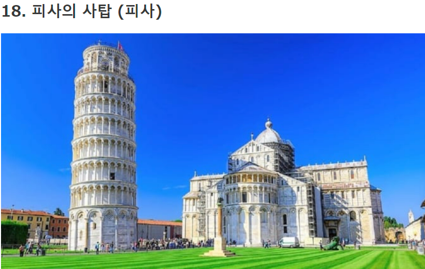 이탈리아에서 가장 유명한 관광 명소 중 하나인 피사의 사탑은 이탈리아 중부 토스카나 피사에 위치하고 있습니다. 높이 약 55m로 비스듬히 기울어진 이탈리아 No.1의 미스터리 관광 시설입니다. 땅이 그다지 안정적이지 않기 때문에 이렇게 기울어 졌다고 하네요.