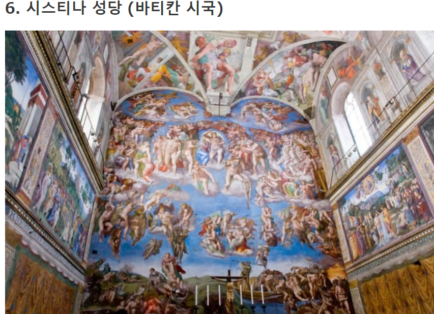 르네상스의 천재 이탈리아 화가 미켈란젤로가 그린 천장화와 벽화가 전시되어 있으며, 미켈란젤로가 60세 때 6년에 걸쳐 그렸다고 전해지는 작품 '최후의 심판'도 전시되어 있습니다.