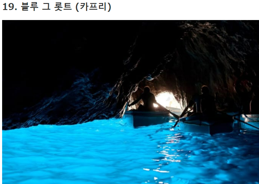 이탈리아 남부의 카프리 섬은 나폴리에서 보트로 1시간 거리에 있습니다. 자연이 풍부한 이 카프리 섬은 아름다운 "푸른 동굴"로 유명합니다. 네온 불빛처럼 동굴 안을 비추는 푸른 바다는 진짜라고는 믿기지 않을 정도로 환상적입니다! 이 푸른 동굴을 찾아 이탈리아에 온 많은 관광객으로 붐빕니다.