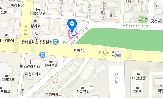 주소 : 인천시 부평구 부평대로 165번길 118(원길 삼거리와 백마 2교 삼거리 사이에 있음)