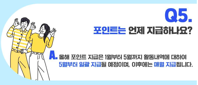 올해 포인트 지급은 1월부터 5월까지 활동내역에 대하여 5월부터 일괄 지급될 예정이며, 이후에는 매월 지급됩니다.
