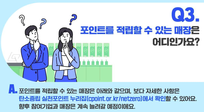 포인트를 적립할 수 있는 매장은 아래와 같으며, 보다 자세한 사항은 탄소중립 실천포인트 누리집에서 확인할 수 있어요. 향후 참여기업과 매장은 계속 늘려갈 예정이에요.