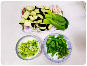 4. Vegetables for eggplant over rice are prepared. Chop 1 garlic and prepare some sliced garlic.