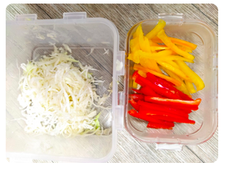 2.Chop the vegetables while the chicken is cooked. Shred cabbage and paprika.