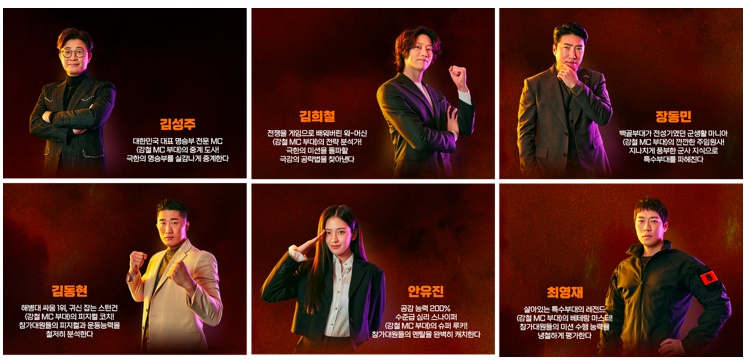 강철부대 1을 너무나 재밌게 봤는데요 이번 시즌2도 너무나 기대가 되네요 매주 화요일만을 기다렸던 기억이 있네요 ^^ 1. MC 시즌 1대비 여성만 변경이 됐는데요 유일한 여성MC로 아이브로 활발하게 활동중인 안유진 으로 이번에도 총 6명이 MC로 출연합니다. 2. 출연 부대 정보 시즌 1에 출연했던 6개 부대에 SART(제6탐색구조비행전대)와 HID(국군정보사령부 특수임무대)가 추가되어 총 8개 부대가 출연합니다. 1) 육국 특수전 사령부 (특전사) 특전사 팀원으로 김황중, 오상영, 최용준, 장태풍이 출연합니다. 2) 해병대 특수수색대 해병대 특수수색대 팀원으로 정호근, 박길연, 이대영, 구동열이 출엽합니다. 3) 제707특수 임무단 707 특수임무단의 팀원으로 이주용, 홍명화, 구성회, 이정원이 출연..